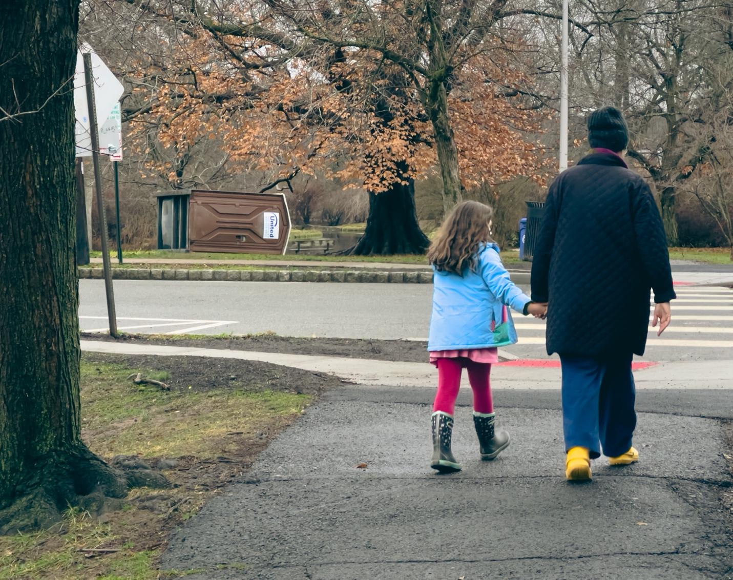My wife and daughter walking through Maplewood Memorial Park, where a portable toilet has been tipped over for some reason